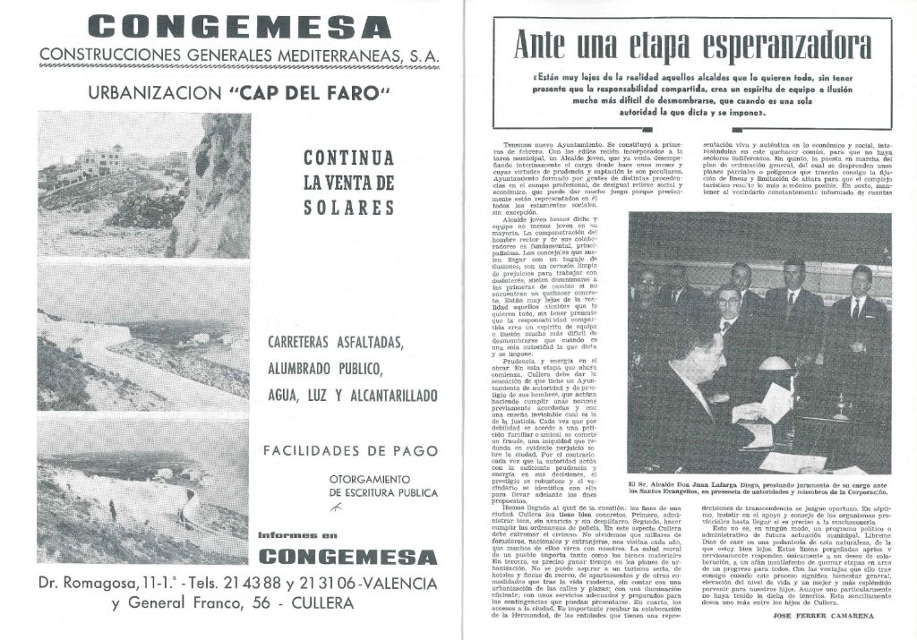 En la publicación de la semana de fiestas de Cullera de 1961 hay un articulo de José Ferrer Camarena llamado “La nueva frontera” donde utiliza el concepto del presidente estadounidense Kennedy sobre la conquista del espacio para relacionarlo con los cambios que debía afrontar la nueva corporación municipal de Cullera. En poco tiempo hay nuevos gobernantes locales que deben afrontar nuevos retos, acordes a un momento donde diversos agentes económicos ven la oportunidad de explotar las posibilidades urbanísticas del municipio.