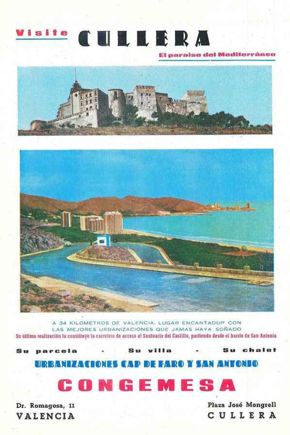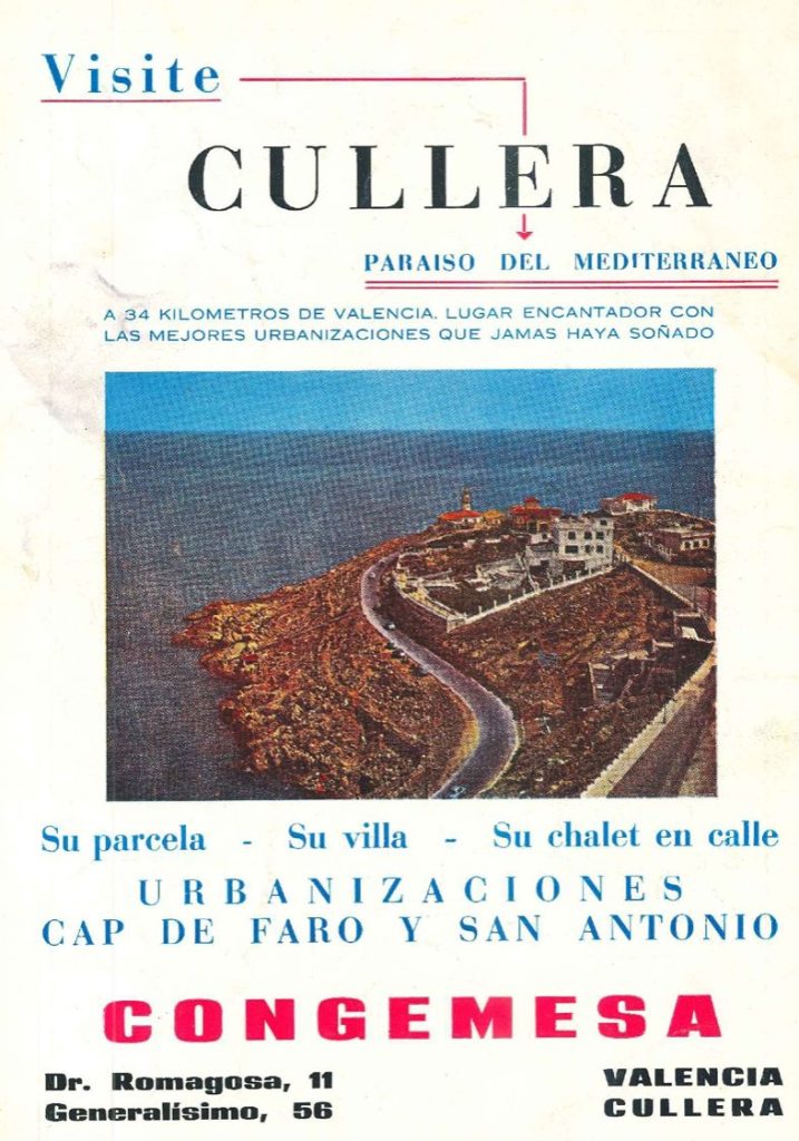 El pleno del Ayuntamiento de Cullera, en sesión extraordinaria de 29 de diciembre de 1961, analiza la propuesta presentada por la empresa Construcciones Generales Mediterráneas S.A. (CONGEMESA) y se aprueba por unanimidad, la realización de las obras de urbanización con finalidad turístico-residencial, del «Monte de Cullera«. La compensación de las inversiones se efectuará mediante la cesión en propiedad, a CONGEMESA, del 85% de los terrenos, quedando para propiedad municipal el 15% restante, así como todos los espacios destinados a vías públicas, zonas verdes, servicios públicos y zonas de protección Histórico-Artístico-Monumental. También se establece que CONGEMESA queda exenta del pago de derechos municipales derivados de la ejecución de las obras urbanísticas y, así mismo, del “arbitrio sobre el incremento del valor de los terrenos correspondiente a la primera transmisión de solares a terceros«. Efectivamente, estamos hablando de una cesión de terrenos a coste cero a una empresa privada con la contraprestación de la urbanización de la montaña de Cullera. En un país subdesarrollado y sujeto a un funcionamiento dictatorial se puede ver como algo ”normal” que se produzca este tipo de situaciones.
