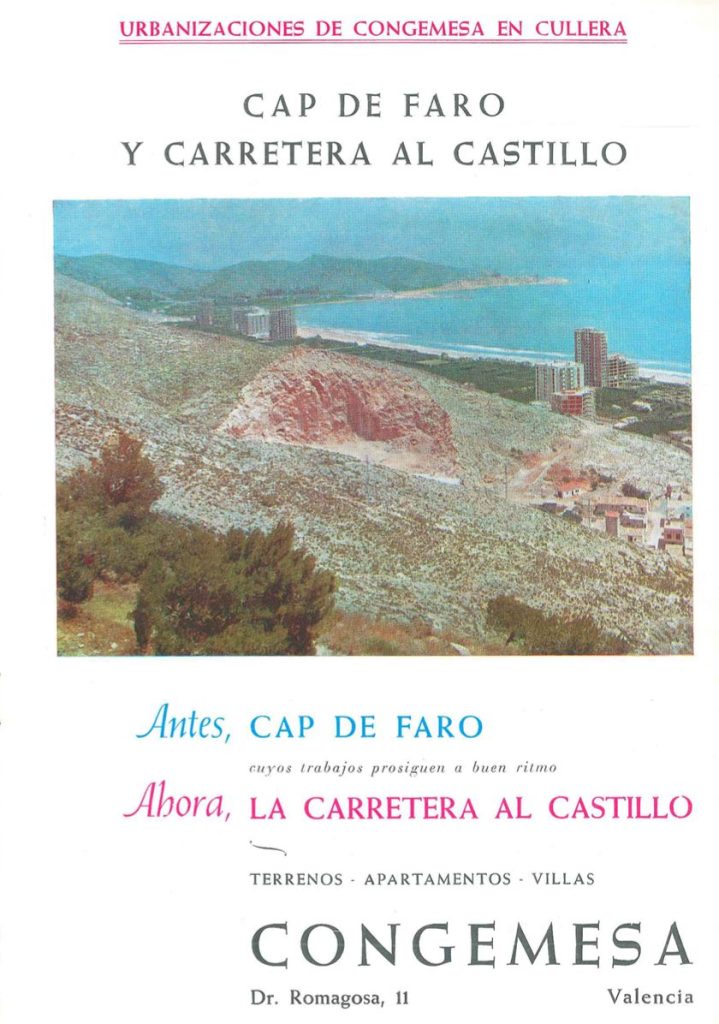 En marzo de 1969 ya se encuentra a punto de finalizar la carretera que comunica San Antonio con el castillo de Cullera. En ese momento todavía se habla de que se trata de uno de los ramales de dicha carretera ya que el otro debe conectar toda la montaña desde el Faro hasta el santuario del Castillo. En la entrevista tradicional al alcalde que se realiza en el programa de la semana de fiestas de 1969 se informa sobre la cesión de CONGEMESA a la Cooperativa Faro Mediterráneo de 500.000 m2 para la urbanización de la montaña en la zona superior más próxima al Faro.