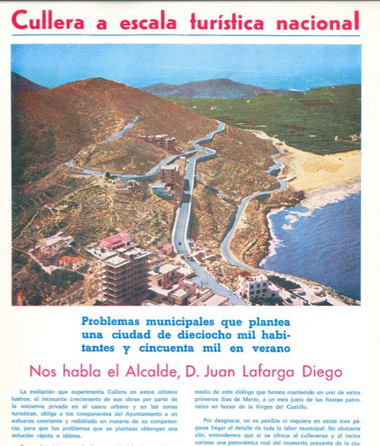 En el saluda del alcalde de Cullera Julio Claver Font dentro del programa de la semana de fiestas de 1962 indica lo siguiente: Cullera, se halla en vías de una gran transformación urbanística, social y económica, merced a la decisión de sus hijos de crear nuevas fuentes de riqueza para el bien común. En éstos planes tendrá un puesto destacado la iniciativa privada, a la que se le presenta una coyuntura favorable. Estos planes se refieren a la urbanización y embellecimiento de la ciudad, al trazado de nuevas calles, a la pavimentación, al alcantarillado, al alumbrado, etc., sin descuidar la zona alta de la población a la que seguiremos prestando especial dedicación. Planes íntimamente ligados con el turismo, tanto nacional como extranjero y que ya el pasado año tuvo efectos bien patentes en la economía local.