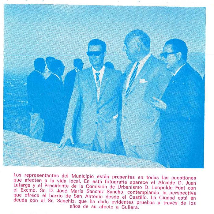En este artículo se han consultado diferentes publicaciones municipales. Hay una de ellas correspondiente al programa de fiestas de 1968 donde aparece una fotografía, previsiblemente, tomada desde el castillo de Cullera que muestra tres personas contemplan el paisaje. En el pie de foto se indica que aparece el alcalde Juan Lafarga, el presidente de la comisión de urbanismo Leopoldo Font y el “Excmo. Sr. D.” José María Sanchiz Sancho. En ese mismo pie de foto, el redactor indica lo siguiente “la ciudad está en deuda con el Sr. Sanchiz. Que ha dado evidentes pruebas a través de los años de su afecto a Cullera”.