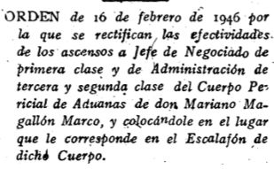 Otra de las referencias es el BOE de 7 de marzo de 1946 donde se acepta su reclamación sobre su ascenso en el cuerpo pericial de aduanas. En la orden se rectifican ascensos anteriores para nombrarlo como Jefe de Administración del cuerpo Pericial de Aduanas. Cuando posteriormente Mariano Magallón encarga el proyecto de villa a Joaquín Rieta, tendrá la edad de 68 años.   Es el año 1953 donde todavía España se encontraba sumida en la autarquía más oscura y las penurias de la posguerra en un país casi totalmente aislado del exterior.